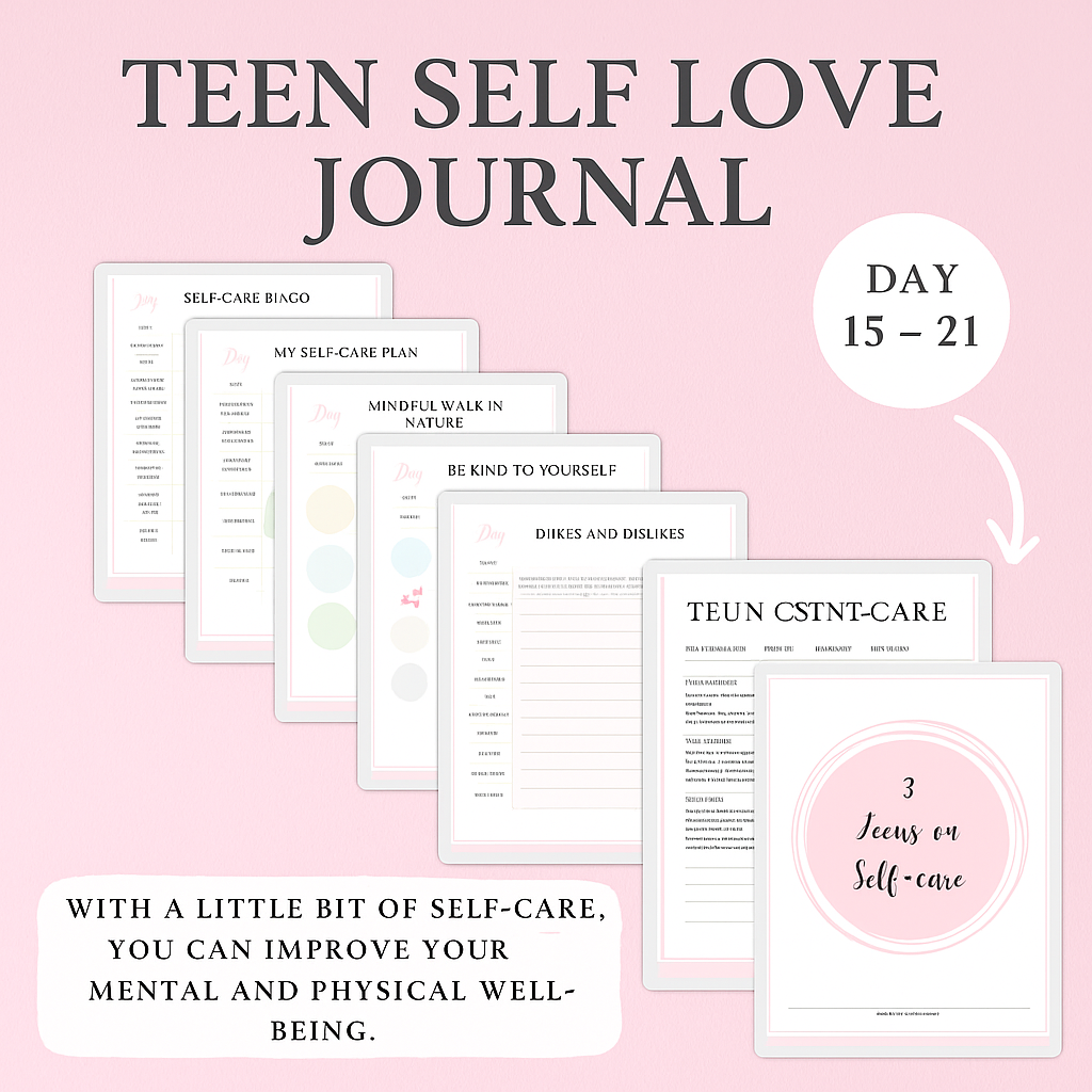 A guided 21-day self-love journal designed for teen girls to build confidence, self-awareness, and daily self-care habits with reflection pages and engaging prompts.